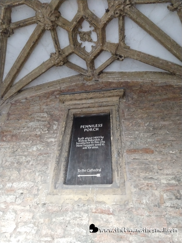 The cathedral itself is definitely worth a visit to Wells. Almost as soon as we entered the city limits we could see the spires towering above the rest of the town city. We were able to park quite a ways away and make our way to the cathedral just by watching for glimpses of the towers rising up above and between other buildings. As we got closer we encountered a town square where a market was taking place. There were stalls selling food, art, jewelry, and more; the food smelled so good it was almost intoxicating - but we had just eaten at home so we didn't get anything. At the corner of the square, there was an entrance to the cathedral grounds known as the "Penniless Porch." The sign let us know that it was "built about 1450 by Bishop Bekynton, a benefactor to this city. Here beggars used to ask for alms."