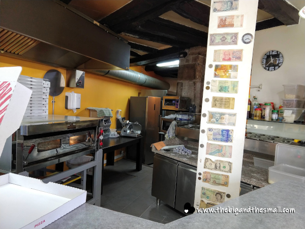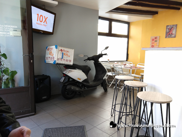 The second the restaurant opened (which happened as the one person working stepped outside to smoke a cigarette) we headed inside to figure out what we were going to order. I could actually read most of the menu and the ingredients listed so I was pretty impressed with myself. We tried to ask the guy which was their best pizza that we should order, but the only thing I really got across was "best pizza" and he thought we were just giving him a compliment. So we ended up just ordering a supreme pizza, and I did understand him when he said it would be a twenty-minute wait! We settled in at a cozy two-person table, that had a view of the delivery motorcycle sitting inside the restaurant.