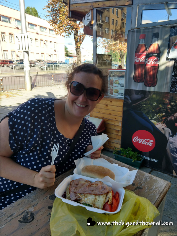 On our first day going downtown we arrived and realized we were very hungry. So before going on our Free Sofia Tour we stopped at the first food stand we saw because we were floored at how cheap the English Breakfast was. We got all of this food for only 4.50 lev which is about $2.25! The breakfast included 2 eggs, bacon, beans, cucumbers, tomatoes, a giant roll, and was enough to fill up both Joel and me.