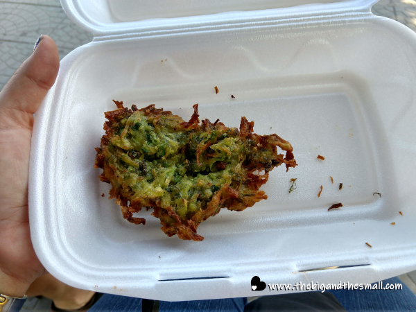 On the day that we ended up riding the bus to nowhere (while in search of a monastery we never found) we did find some excellent food. We couldn't buy as much as we wanted of it because we ran out of cash, but we got a good taste. First was a fried zucchini cake which seemed to consist of shredded zucchini mixed with some sort of batter then fried. It was served piping hot and I wish I could have had about 10 of them instead of just half of one (I begrudgingly let Joel try the other half.)