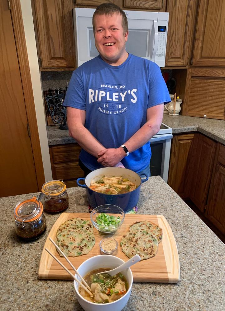 Thursday Doughday: Being a cool, rainy, springtime in Iowa day, we decided soup for dinner was in order. We happen to love Asian food, so we thought the combination of Potsticker soup and Scallion pancakes with some homemade chili sauce would warm up the body and soul.