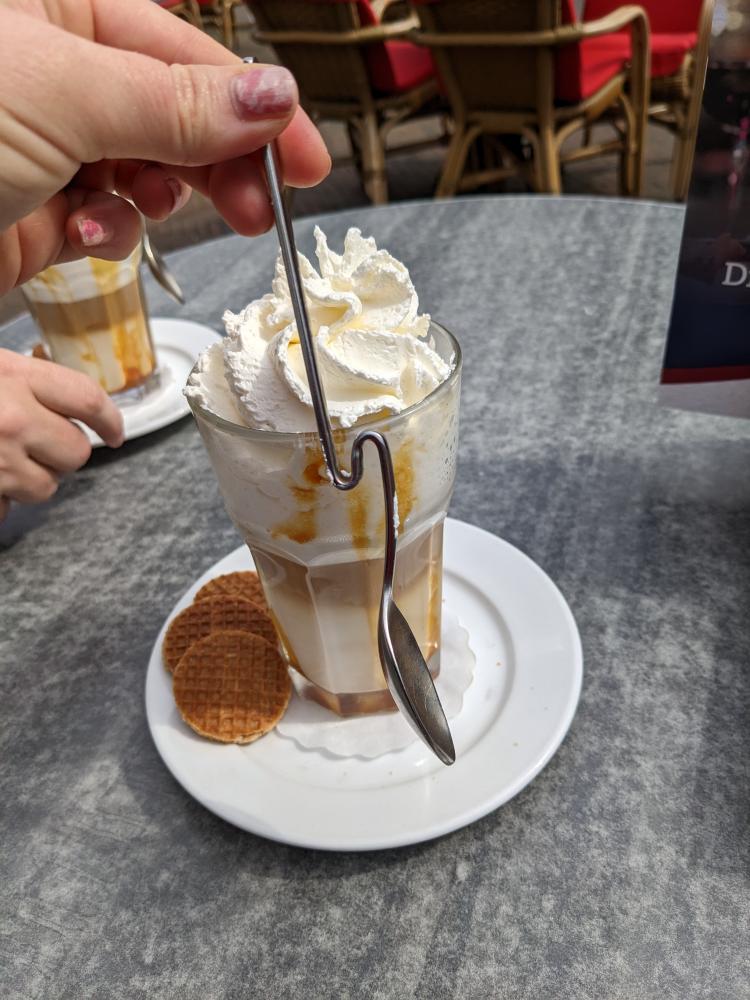 We ordered the most decadent caramel macchiato that also came with stroopwafel. I was delighted by this fancy spoon made to sit on the side of the glass!