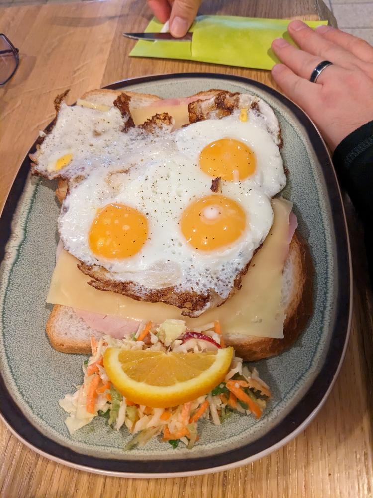 We also got this open-faced sandwich which sounded fancier when the guy was describing it to us. It was basically just white bread with him and gouda, topped with two fried eggs, and a side of coleslaw. It was a little bit awkward to eat with the runny eggs, and definitely something I could/would make at home, but tasty enough.