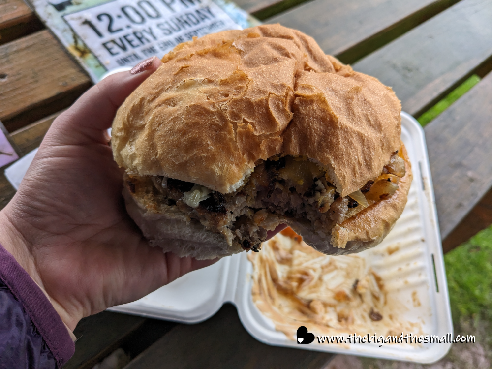The next Friday was less exciting, but still fun. We drove East towards Lydney and stopped at a burger van we have passed many times and always say “hey, we should stop there sometime.” So this time, we did! We ordered a full breakfast sandwich (basically a Full English on bread) and a Wild Boar burger. Both were delicious and we will hopefully be back, maybe on a day when the weather is nicer for eating outside.